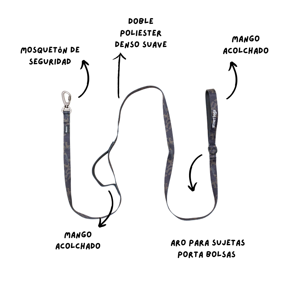 Está hecha de doble polyester denso, lo cual la hace ultra resistente. El mosquetón posee un mecanismo de bloqueo y gira en 360 grados, aportando mayor seguridad y comodidad, evitando que la correa se enrede.